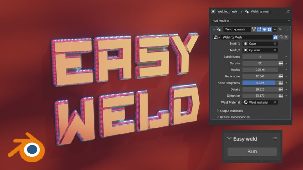 Easy Weld is a Blender addon that creates a procedural weld mesh between two selected objects using Geometry Nodes. It simplifies the process of adding realistic welds in Blender, providing flexibility and control over the welding effect. Whether you're working on mechanical models, hard surface designs, or sci-fi creations, Easy Weld offers a quick and easy way to apply a professional weld effect.